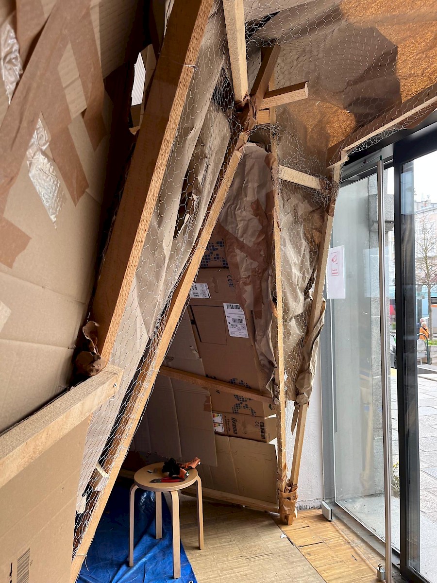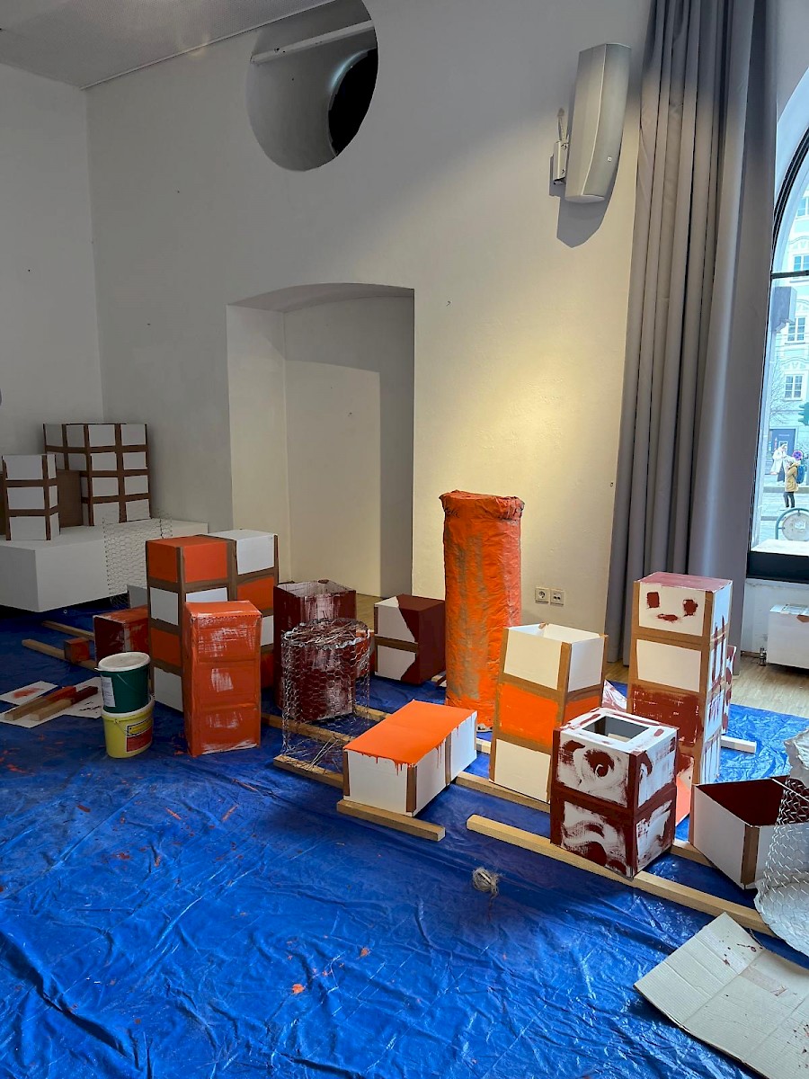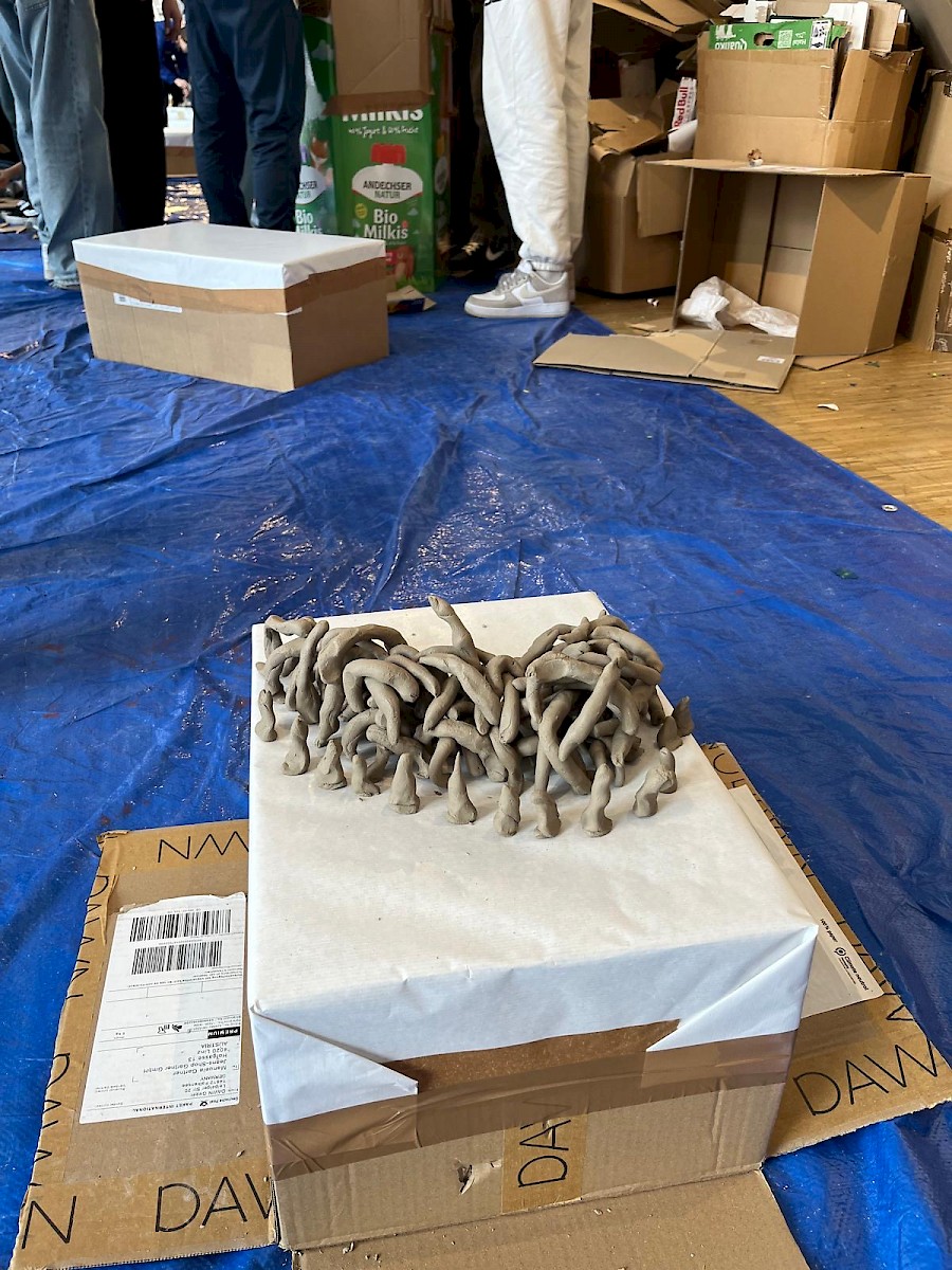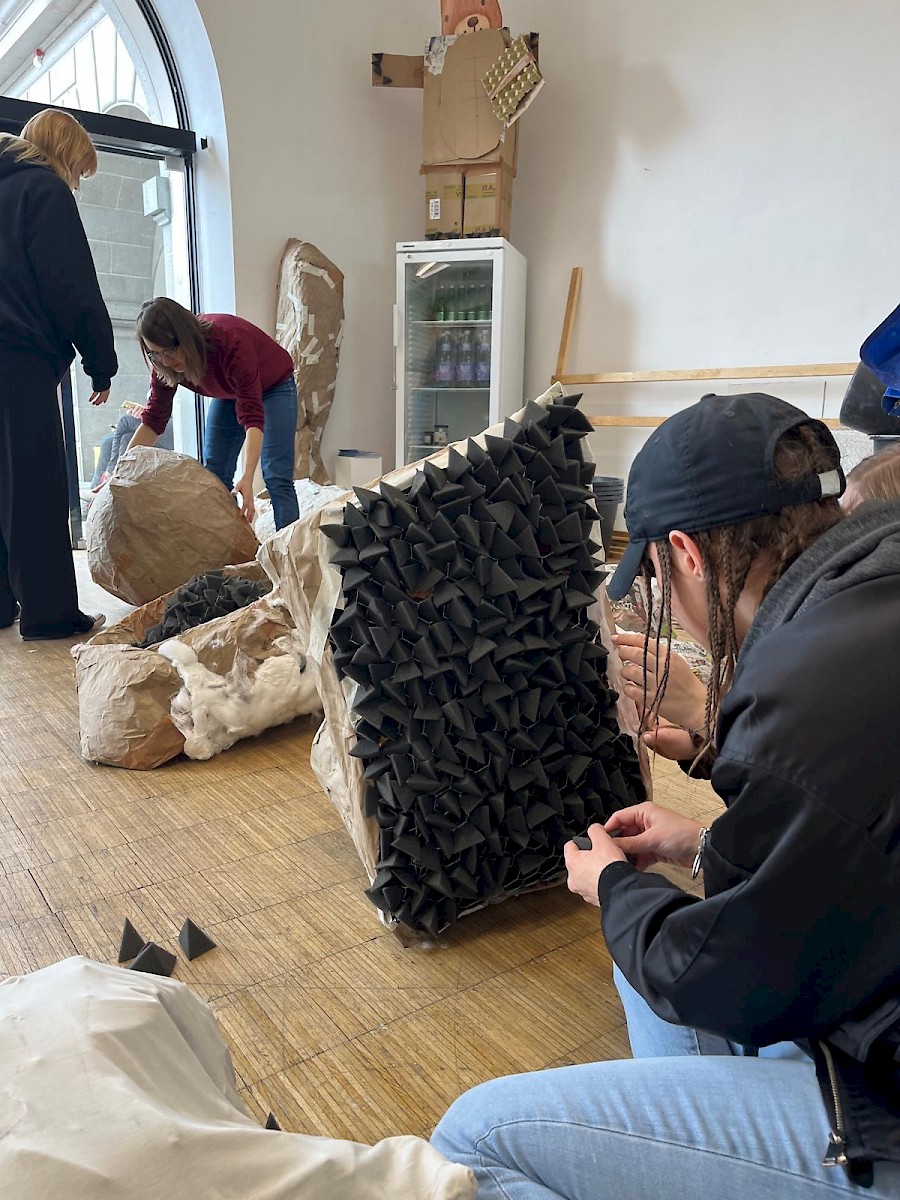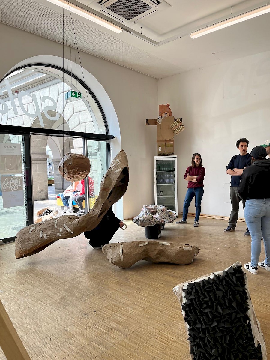 Gemeinsam verbrachten die Studierenden einige Tage im Splace, arbeiteten in kleinen Gruppen mit vorgegebenen Materialkontingenten. Nach einer Ausstellung am 11.04. wurden die Skulpturen zum Teil bei einer Parade in Gedenken an feministische Landverteidigerinnen zu öffentlichen Raumteilern umfunktioniert.
